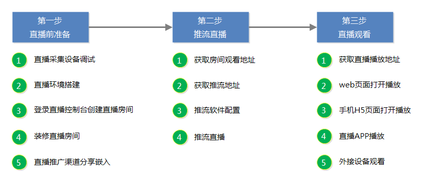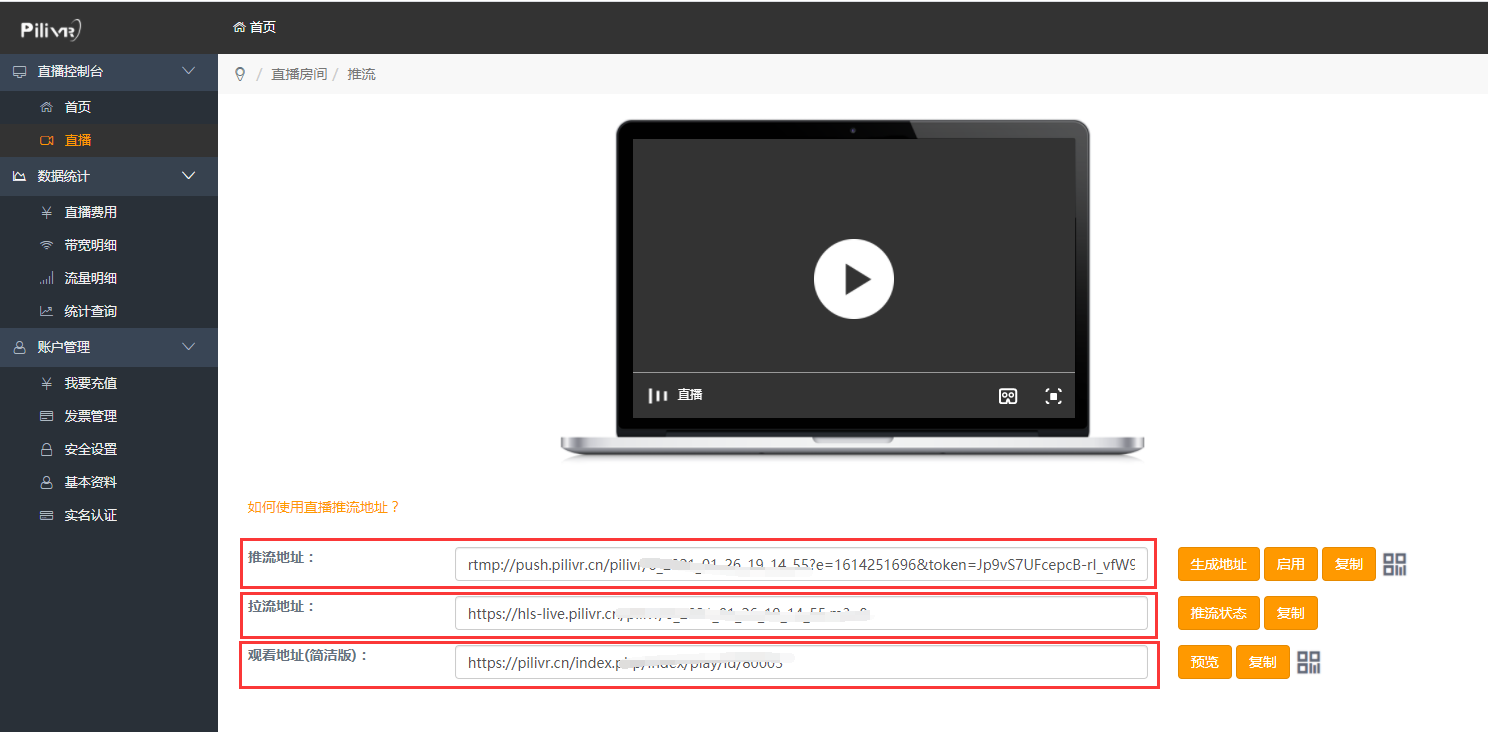 一个直播房间对应唯一观看地址和推流地址,推流地址作为直播推流时使用,观看地址则是在直播成功后,作为观众在PC/H5直接打开观看使用。