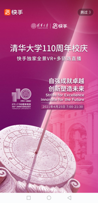 清华是国内历史悠久、地位卓然的名校,4月25日,正值清华大学建校110周年校庆,快手被授权为活动传播媒体之一,推出多链路全景直播,将清华校园“搬”到了线上,并完成此次校庆日特别节目15小时不间断直播,形成以“清华大学”为主账号,链接“快手正能量”、“快手见政”、“快手人间”的四链路全景直播,并邀请学校老师作为主持人,进行移动VR游园直播。