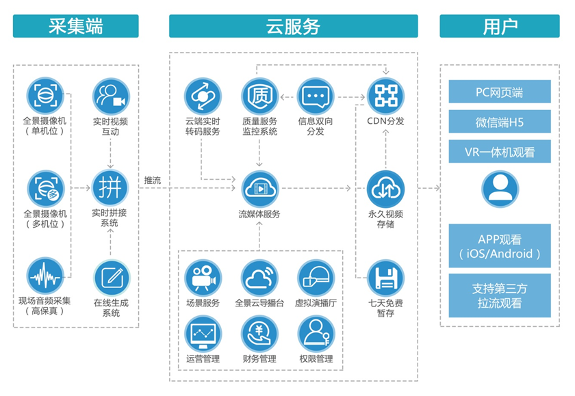 我们专业提供B端用户及广电360度全景VR直播技术解决方案。为您提供基于VR的视频推流直播、云服务、云存储、内容分发、全平台播放等服务。支持多终端PC/APP/H5实时观看直播,为您实现完整的端到端的VR直播服务!