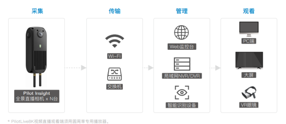 Pilot Insight全景直播相机直输4K /8K360°全景画面,利用本地局域网传输到观看端。用户可通过Web监控台全天候监控同一区域多台相机的实时运作情况和远程调整相机参数。