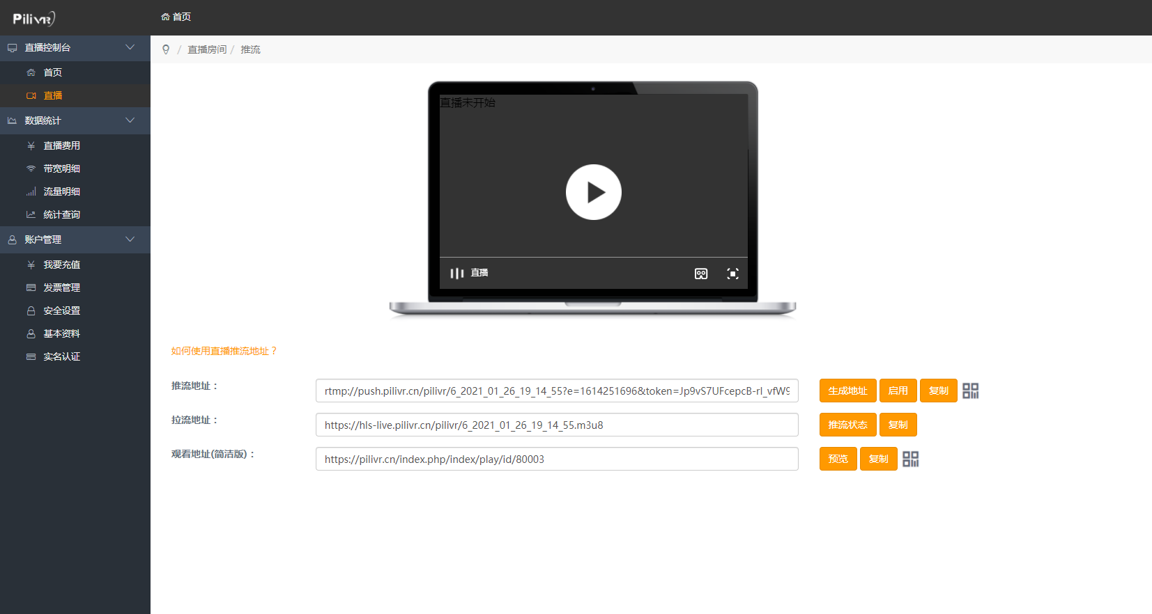 2、PiliVR直播平台VR直播控制台,创建直播房间,获得房间对应的RTMP推流地址和直播观看地址,保障帐号有余额的情况下成功推流直播。PiliVR直播平台已具备CDN分发能力,高质量多节点,低延时极速传达,无观看人数上限,保障直播!