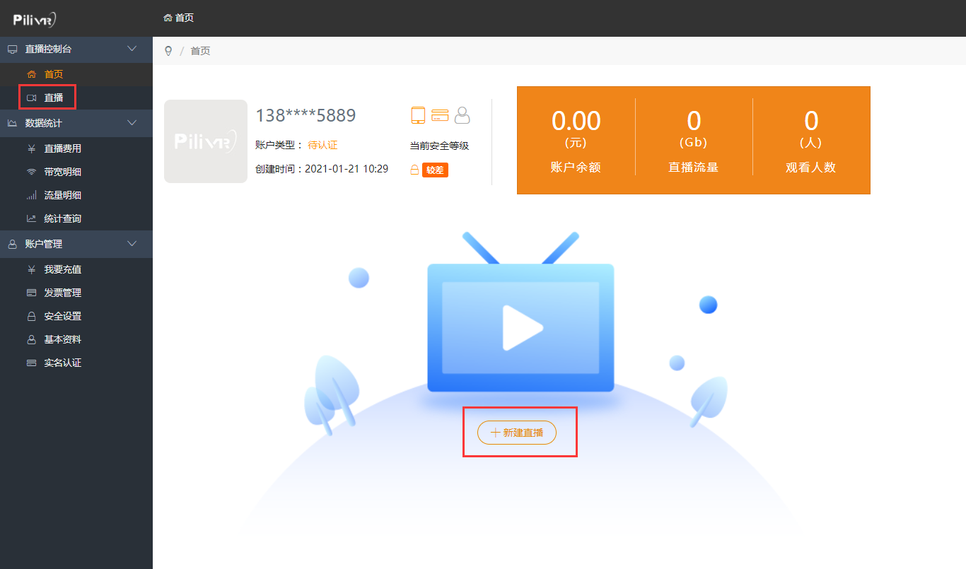 1、直播平台账号注册: 创建一个直播活动之前,首先我们需要先获得PiliVR直播平台账号。